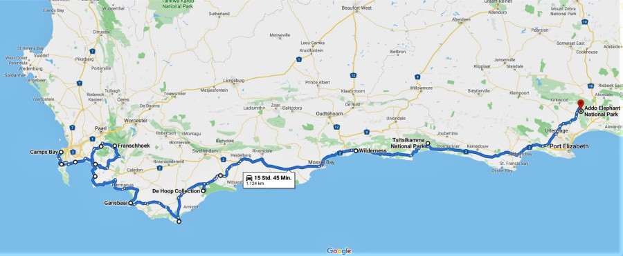 Gesetzt war dabei Kapstadt, Franschoek, Gansbaai und De Hoop, fehlen durften aber auch Tsitsikamma und Addo NP nicht und so hatten wir folgende Route zusammen: