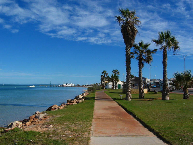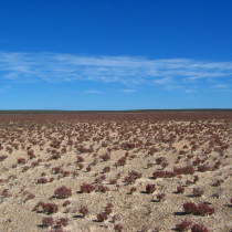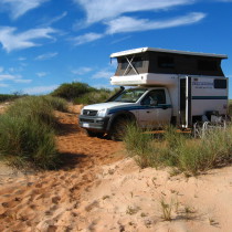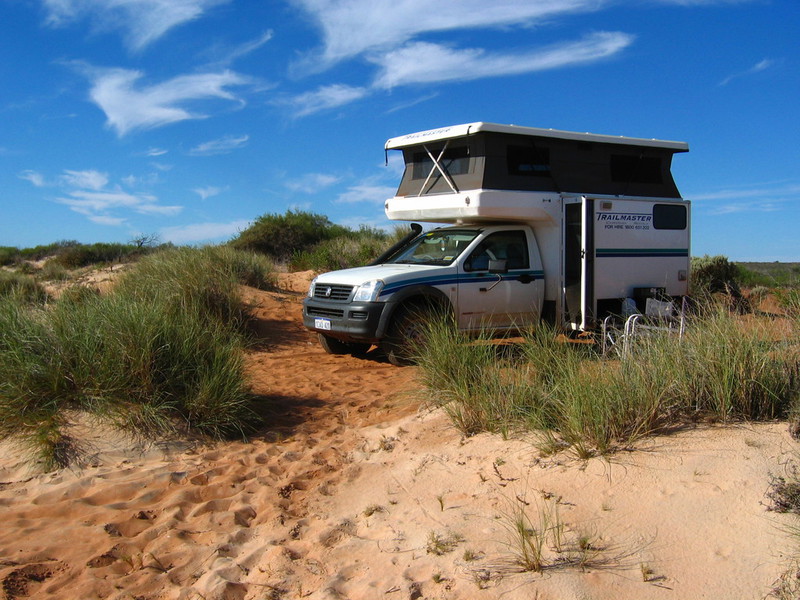 Verteidigen müssen wir unsere Frühstücks-Cerealien gegen ein ortsansässigen, ziemlich dreisten Emu, der sich fast nicht verscheuchen lässt (wir geben nichts!). Etwas später sind wir bereits auf dem Weg nach Denham. Dort angekommen informieren wir uns im CALM-Office nach den Gegebenheiten im Francois Peron National Park und kümmern uns um den Reifendruck. Breit und weich müssen die Reifen sein, also lassen wir entsprechend viel Luft raus. Die ersten 6 km bis zum Homestead (alte Schaffarm) könnte man auch ohne den verminderten Reifendruck bewältigen, der Rest aber ist ohne Allrad und niedrigem Reifendruck fast nicht zu machen. Und so beginnt unser 43 km langer Ritt zum Cape Peron. Nichts für schwache Nerven. Zum Teil ist die Piste sehr schmal, zum Teil auch der Sand sehr weich und dann geht’s auch noch durch diverse Salzpfannen, die zwar bretthart, aber mit unzähligen Schlaglöchern gespickt sind.