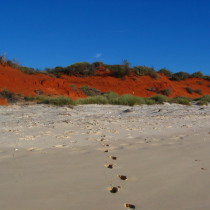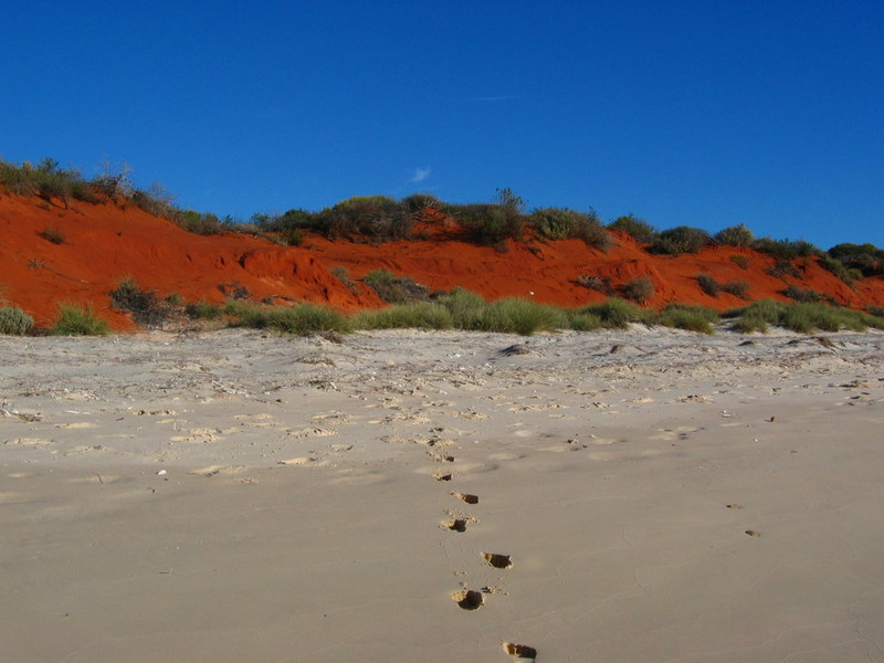 Wir genießen den herrlichen Strand. Eine Wahnsinnskulisse – weißer Strand, roter Sand und Spinifex bis zum abwinken; von der Farbe des Wassers ganz zu schweigen. Ein Traum. Wir laufen vom Cape Peron bis zum Skipjack Point (gute 3km) und haben eine tolle Sicht auf die Bucht. Vom Skipjack Point kann man sogar Haie sehen (und keine kleinen!), die an der Küste patrouillieren. Viele Fische, Schildkröten und einen Delphin sehen wir auch. Es gefällt uns so gut, dass wir uns entschließen die Nacht hier draußen zu bleiben. Wir fahren bis zur Bottle Bay, nein wir reiten zur Bottle Bay, sehen uns diese an, gucken uns noch eine andere Campsite an, um dann wieder zurück zur Bottle Bay zu reiten. Hier ist der Strand eindeutig schöner. Vor dem verdienten Kaffee gehen wir auch kurz ins Wasser (nur bis zum Oberschenkel). Die Erinnerung an die Haie lässt uns nicht lange durchhalten, außerdem ist das Wasser doch schattiger, als gedacht. Wir laufen noch ein bisschen den Strand entlang. Da es hier so viel zu entdecken gibt (Muscheln, Korallen, Krebse, Fußspuren diverser Tiere, etc.), dauert es doch fast bis zum Sonnenuntergang.