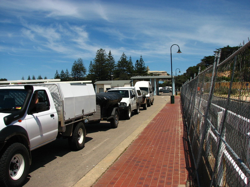 Jetzt gegen 18.00h wird die Straße wieder frei gegeben. Leider finden wir den Campground nicht, so dass wir zurück zu der Stelle im Ort fahren, wo wir eigentlich nicht übernachten wollten (direkt hinterm Supermarkt gelegen). Als wir im Office einchecken, erfahren wir, dass der gesuchte Campground nicht vor Weihnachten öffnet. Z.Zt. sind nur zwei der sechs Campgrounds geöffnet (lohnt sich wohl außerhalb der Saison nicht). Wir stellen den Wagen auf Platz Nr. 85 und laufen dann noch mal zum Beach. Erst geht’s noch über die Schwingbrücke auf die andere Seite, dann über den Strand bis zum Ortskern. Hier werden wir noch Zeuge, wie all die Porschefahrer, nebst Begleitung, angehübscht im Festzelt verschwinden (da sind schon ein paar Bonbons dabei)