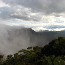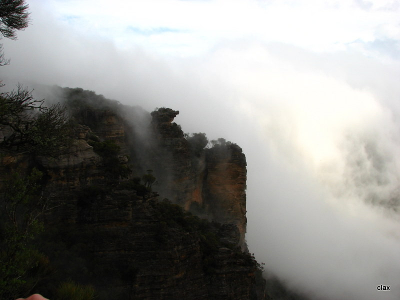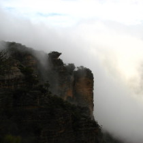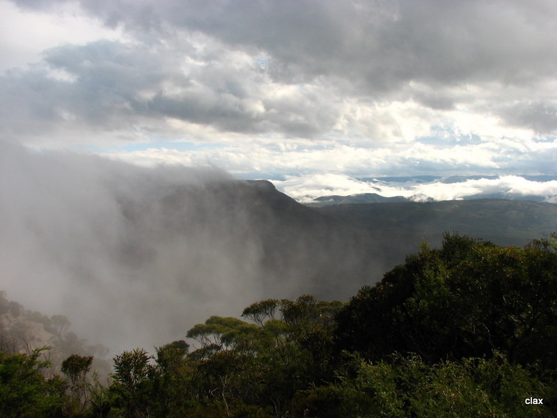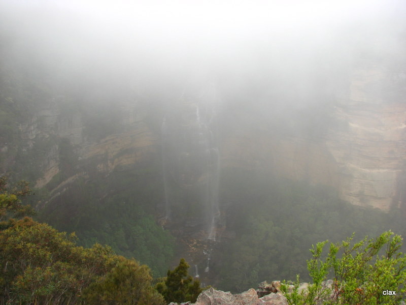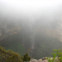 Wenig später sind wir in den Blue Mountains. Blauer Dunst, könnte sein, aber bei den Regenwolken nicht ganz zu erkennen. Leider hat sich das schlechte Wetter ziemlich festgesetzt, so dass man von der wahren Schönheit nicht viel mit bekommt. Wir fahren über den Scenic Drive, aber wirklich viel Sinn macht das nicht. Auch ein kurzer Marsch zum Lookout der Wenworth Falls lohnt bei dem Hochnebel wenig, man sieht gar nichts.
